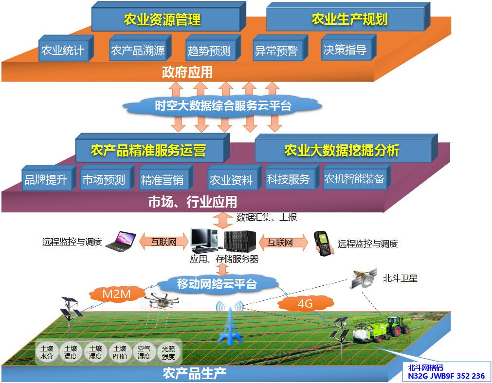 农业大数据综合服务体系以北斗导航网格码为依托,以时空大数据综合服务云平台、物联网、大数据技术等为支撑,实现了数据资源统一接入、整合存储、高效处理、挖掘分析、监控预警等功能,服务于农产品生产、市场行业应用及政府应用。总体架构如下图所示: